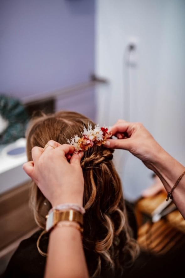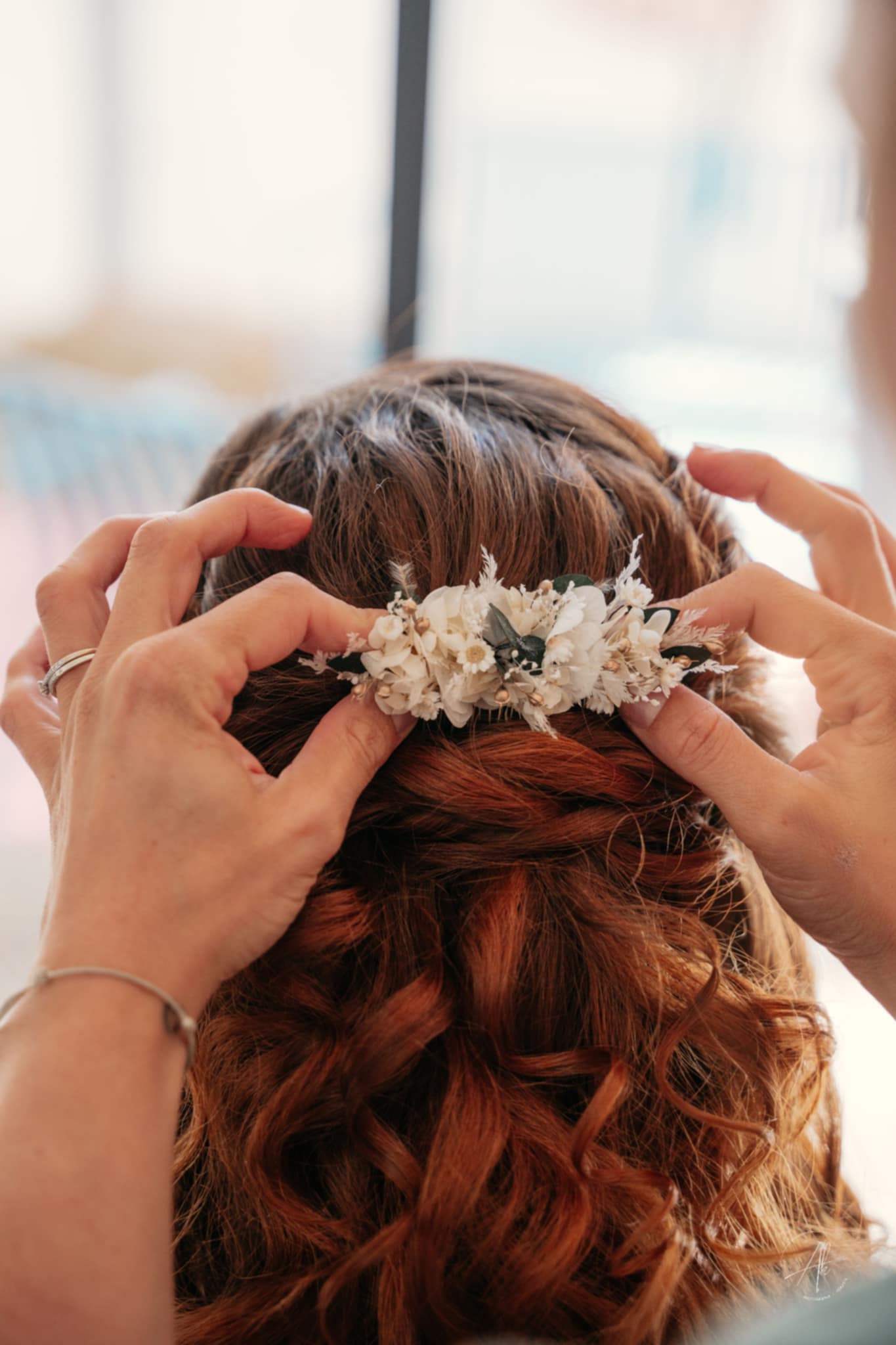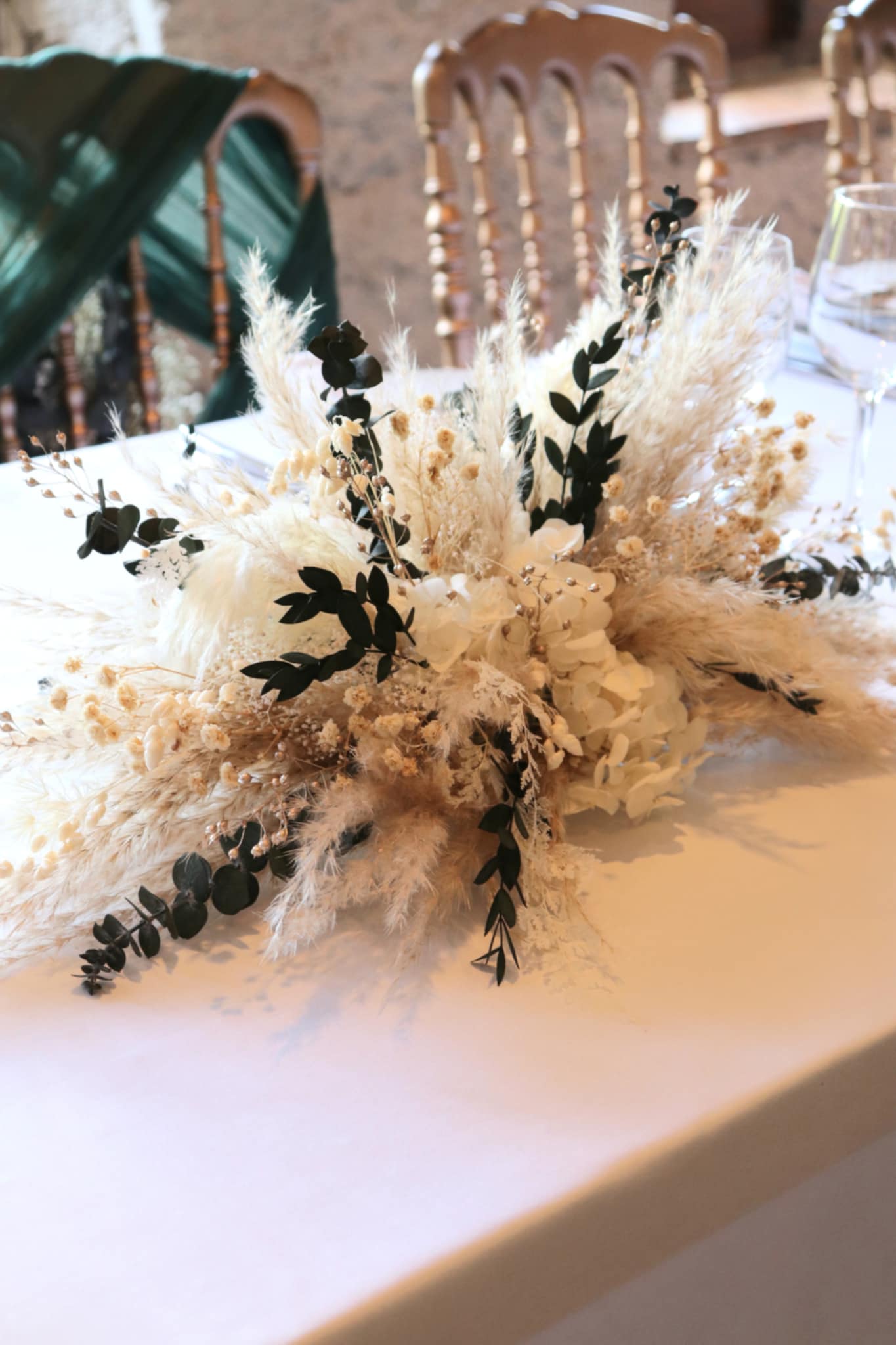 Centre de table, arche fleurie, couronne de mariée, bracelet, peigne, bouquet de mariée, boutonnière… L’Esprit Sauvage met son savoir faire au service des mariés qui souhaitent une prestation sur-mesure en accord avec leur personnalité et leurs envies.