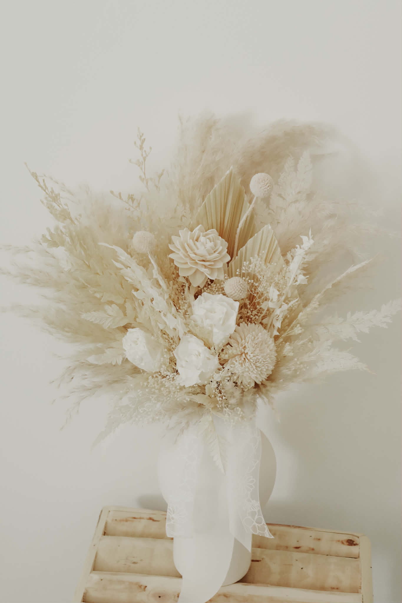 Bouquet monochrome composé avec des fleurs séchées / stabilisées blanches, sélectionnées spécialement pour votre mariage. La réalisation demande du temps et de la minuties.