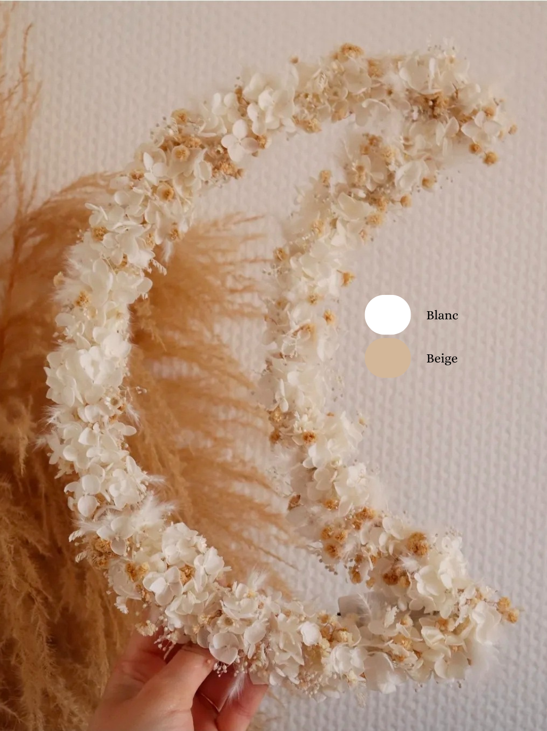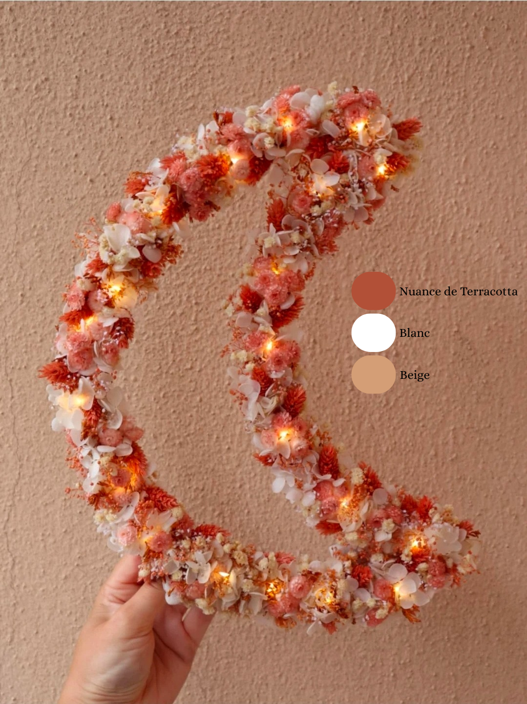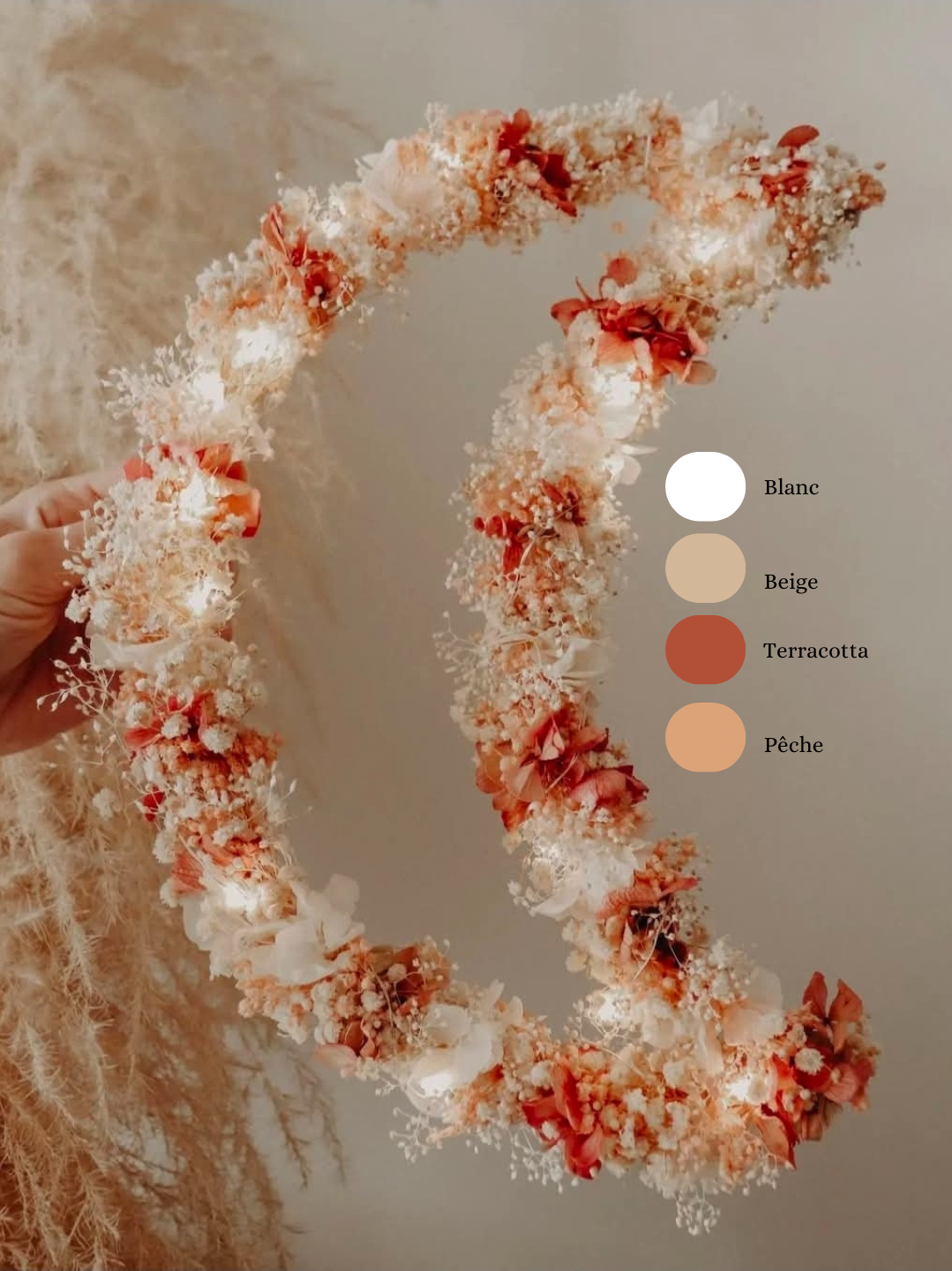 La veilleuse lune est confectionnée en fleurs séchées naturelles et stabilisées sur une base en fer. Celle-ci est agrémentée d’une guirlande LED couleur chaude à pile, le boîtier se trouve fixé derrière la création. Vous pouvez personnaliser la lune avec vos couleurs.