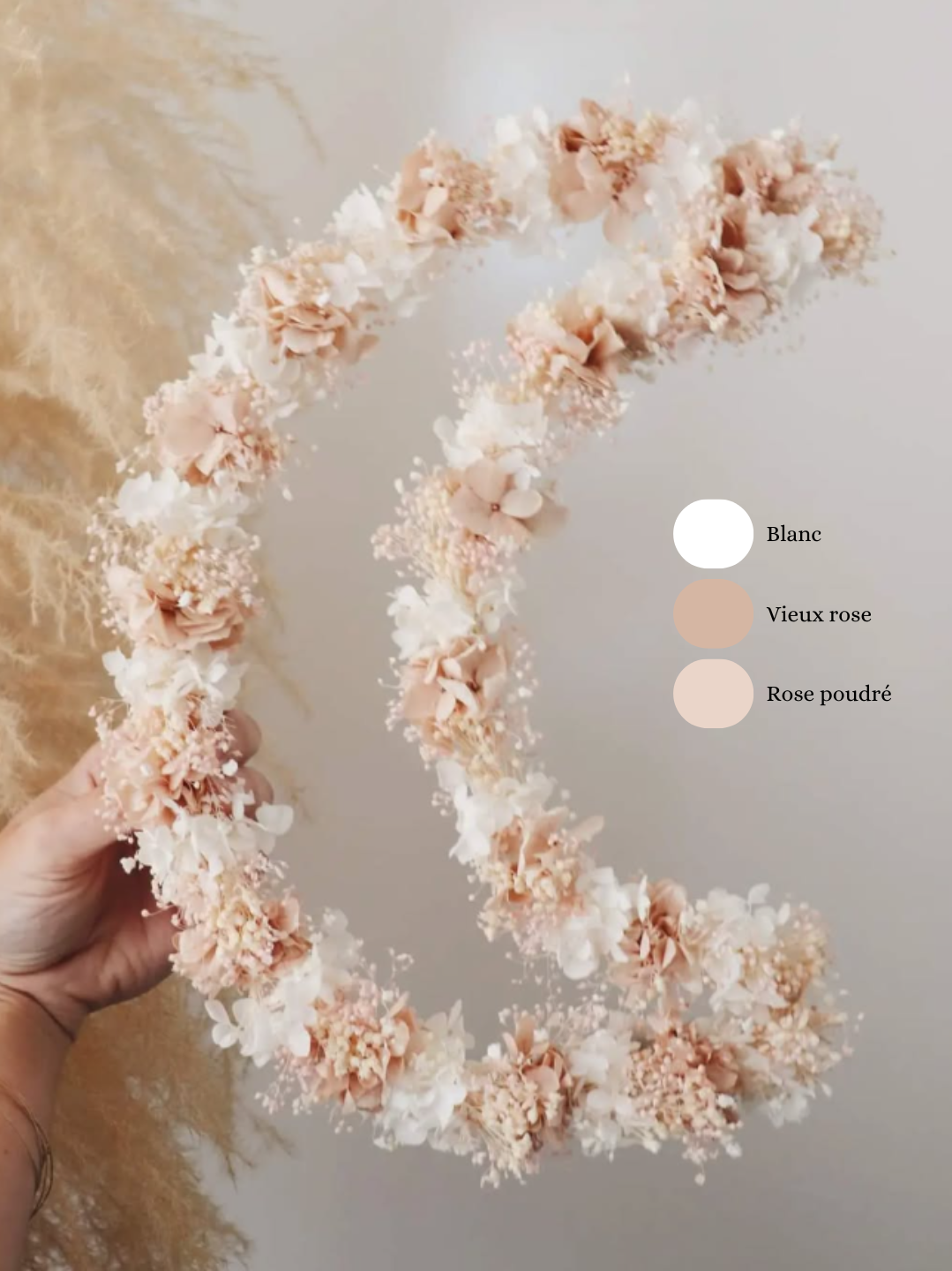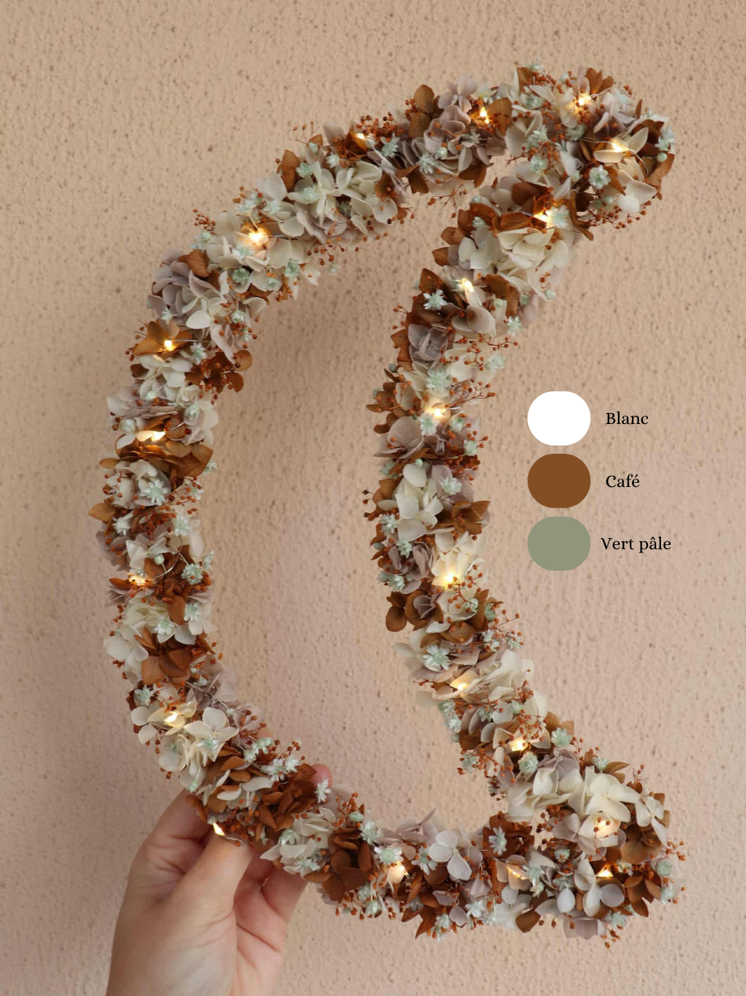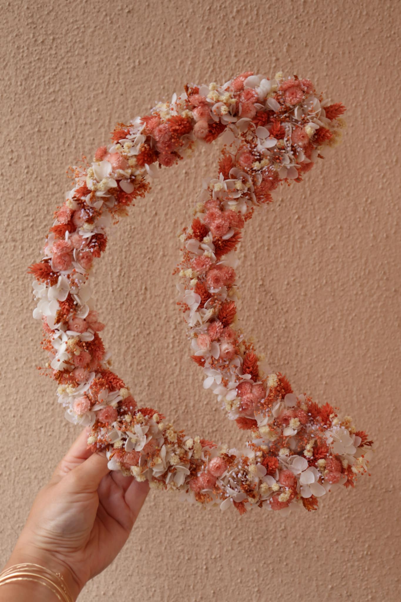La veilleuse lune est confectionnée en fleurs séchées naturelles et stabilisées sur une base en fer. Celle-ci est agrémentée d’une guirlande LED couleur chaude à pile, le boîtier se trouve fixé derrière la création. Vous pouvez personnaliser la lune avec vos couleurs.